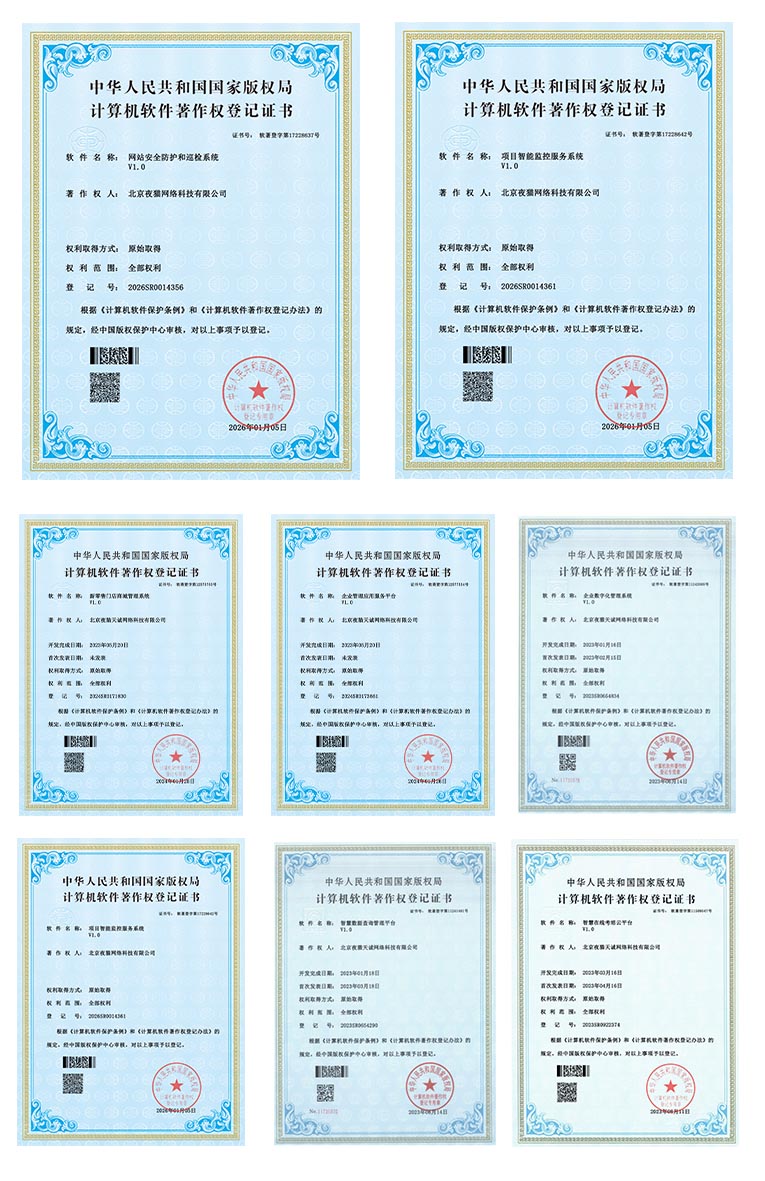 2026年伊始,夜猫网络研发团队传来喜讯,由团队自主研发的网站安全防护和巡检系统、项目智能监控服务系统两套核心系统,成功通过国家版权局审核,获得计算机软件著作权登记证书。这两项成果的落地,不仅是对团队技术研发能力的权威认可,也为企业在数字化服务领域的深耕奠定了坚实的技术基础。